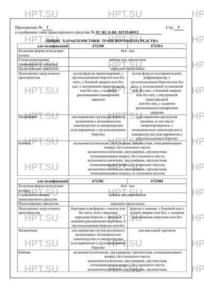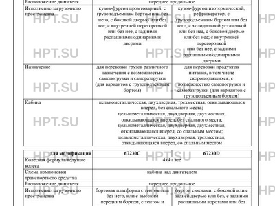 | Оборудование ТС | устройство ограничения максимальной скорости (функцию устройства ограничения максимальной скорости выполняет электронный блок управления двигателем); устройство вызова экстренных оперативных служб с функцией автоматического срабатывания при опрокидывании по заказу: предпусковой подогреватель двигателя; лебедка; коробка отбора мощности; кондиционер; передние противотуманные фары (кроме модификаций на базе шассси, имеющих официальное утверждение на основании Правил ООН № 48-04); спутниковое навигационное оборудование, брезент, грузоподъемные борта, краноманипуляторная установка, инструментальные ящики, специальный предупреждающий огонь автожелтого цвета, тахограф, обтекатель крыши; топливный бак повышенного объема, дополнительный топливный бак, коробка отбора мощности, предпусковой нагреватель, стеллажи, шкафы, рундуки, сиденья предназначены для использования только во время стоянки, столы; холодильная установка (для мод. 67230А); каркасы тентов различной формы с распашными задними воротами или рольставнями или клапан тента, боковые двери в фургоне, альков, высокие борта |
