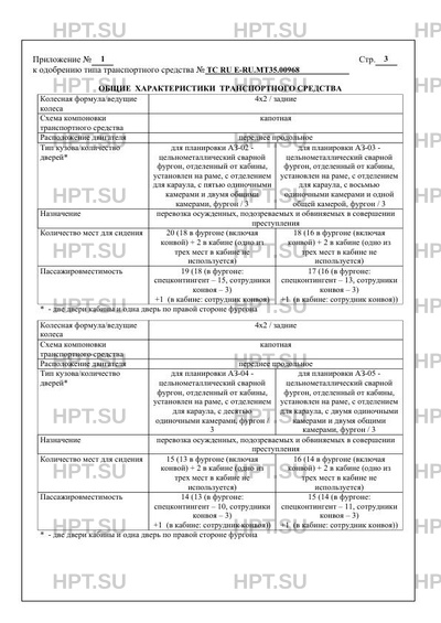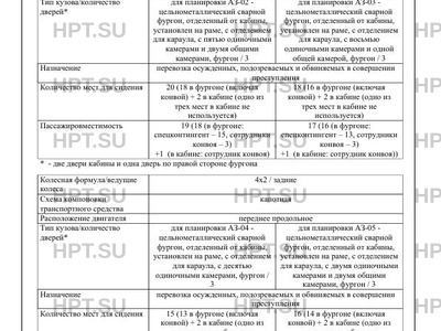 Пассажировместимость 19 (18 (в фургоне: спецконтингент - 15, сотрудники конвоя - 3) +1 (в кабине: сотрудник конвоя) 17 (16 (в фургоне: спецконтингент - 13, сотрудники конвоя - 3) +1 (в кабине: сотрудник конвоя)) 14 (13 (в фургоне: спецконтингент - 10, сотрудники конвоя - 3) +1 (в кабине: сотрудник конвоя)) 15 (14 (в фургоне: спецконтингент - 11, сотрудники конвоя - 3) +1 (в кабине: сотрудник конвоя))