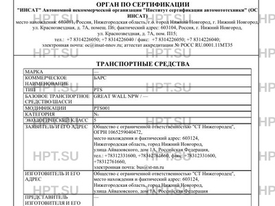 | Орган по сертификации | Орган по сертификации "ИНСАТ" Некоммерческого партнерства "Институт сертификации автомототехники" (НП "ИНСАТ") |