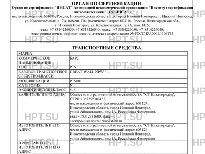 | Орган по сертификации | Орган по сертификации "ИНСАТ" Некоммерческого партнерства "Институт сертификации автомототехники" (НП "ИНСАТ") |