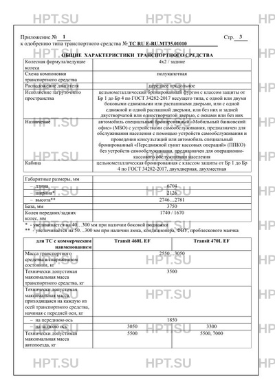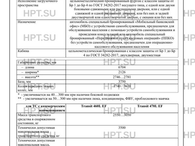 | Оборудование ТС | устройство вызова экстренных оперативных служб, подушка безопасности водителя, специальный сигнальный огонь белоОдобрение типа транспортного средства № Стр. лунного цвета, пуленепробиваемая броневая обшивка, бойницы, дополнительные механические запоры дверей по заказу: центральная блокировка дверей, подушка безопасности пассажира (ов), тягово-сцепное устройство, кондиционер, устройство спутниковой навигации, тахограф, спойлер, рундуки, стол, ГЛОНАСC, электропривод сдвижной двери или распашной двери, камеры наружного видеонаблюдения с регулировкой угла обзора, дополнительные отопители салона, цветографическая схема, генератор, банкомат, сейф, сиденья в грузовом отсеке, используемые во время стоянки |