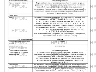 | Исполнение загрузочного пространства | Фургон общего назначения с задними и/или боковыми дверьми распашного и/или сдвижного и/или подъемного и/или рулонного типа, с 1...6 сиденьями для перевозки пассажиров, с окнами, с люками, внутренними перегородками, с багажником и лестницей, с холодильной или отопительной или вентиляционной установкой, с передним обтекателем или без них Фургон изотермический или рефрижератор с задними и/или боковыми дверьми распашного и/или сдвижного и/или подъемного и/или рулонного типа, с окнами, с люками, внутренними перегородками, с багажником и лестницей, с холодильной или отопительной или вентиляционной установкой, с передним обтекателем или без них Фургон (с задними и/или боковыми дверьми распашного и/или сдвижного и/или подъемного и/или рулонного типа, с окнами, с люками, внутренними перегородками, с багажником и лестницей, с холодильной или отопительной или вентиляционной установкой, с 1...6 сиденьями для перевозки пассажиров, с передним обтекателем или без них) Фургон с задними и/или боковыми дверьми распашного и/или сдвижного и/или подъемного и/или рулонного типа, с пожарнотехническим вооружением, с 1...6 сиденьями для перевозки пассажиров, с окнами, с люками, внутренними перегородками, с багажником и лестницей, отопительной или вентиляционной установкой Фургон с задними и/или боковыми дверьми распашного и/или сдвижного и/или подъемного и/или рулонного типа, с окнами, с люками, внутренними перегородками, с багажником и лестницей, с холодильной или отопительной или вентиляционной установкой, с передним обтекателем или без них Фургон с задними и/или боковыми дверьми распашного и/или сдвижного и/или подъемного и/или рулонного типа, с окнами, с люками, внутренними перегородками, с багажником и лестницей, с 1...6 сиденьями для перевозки пассажиров, с холодильной или отопительной или вентиляционной установкой, с передним обтекателем или без них с бортовой платформой (с откидными и/или фиксированными бортами, с задними распашными воротами, с тентом или без них) или без нее, с крано-манипуляторной установкой или многофункциональной крано-манипуляторной установкой (с различным навесным оборудованием), расположенной за кабиной или за фургоном или на заднем свесе или без нее Фургон, с окнами, с задними и/или боковыми дверьми, с внутренними перегородками с передним обтекателем или без них, грузоподъемным бортом или без него Кузов-фургон с задними и/или боковыми дверьми распашного и/или сдвижного и/или подъемного и/или рулонного типа, с пожарнотехническим вооружением, с 1...6 сиденьями для перевозки пассажиров, с окнами, с люками, внутренними перегородками, с багажником и лестницей, отопительной или вентиляционной установкой, с цистерной для воды, с пенобаком или без них |