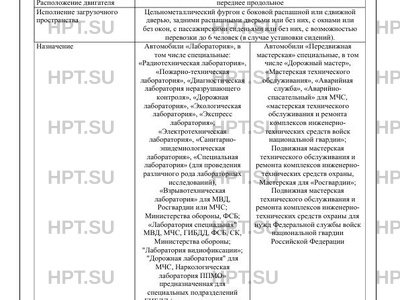 Оборудование ТС система электронного контроля устойчивости, устройство вызова экстренных оперативных служб с ручным включением и автоматическим срабатыванием при опрокидывании; дневные ходовые огни; СГУ (сигнальное громко-говорящее устройство), цветографическая раскраска - для автомобилей оперативных служб по заказу: кондиционер, догреватель охлаждающей жидкости, предпусковой подогреватель, противотуманные фары, подушка безопасности водителя или подушка безопасности водителя и подушка безопасности передних пассажиров кабины; трансформируемое сиденье второго ряда; центральная блокировка дверей, тягово-сцепное устройство, кондиционер мобильный, автомобильный холодильник, светодиодные балки, световая панель, сигнализация с обратной связью, фара-искатель, магнитола, автомобильный видеорегистратор, датчики парковки, возимая радиостанция, система электроснабжения напряжением 220 В; (включая генераторную установку, розетки, преобразователь напряжения и бортовой ввод, автоматы защиты); розетки напряжением 12 В, принудительная вентиляция, сиденья, стол, откидной стол, откидное сиденье, умывальник, сейф, дополнительный автомобильный аккумулятор, лестница стремянка, закрепленная на смотровой площадке; мебель (шкафы, антресоли, полки, тумбы, выдвижные ящики, стеллажи), позволяющая размещать и перевозить: - специальные полевые приборы и оборудование , оргтехнику, измерительные приборы и инструменты, механический инструмент, электроинструмент, шанцевый инструмент, осветительное оборудование, средства защиты и спасения, комплект инструментов и приборов, прожектор, система пожаротушения; рундуки, сиденья и стол для проведения оперативных совещаний и следственных действий, газовая плита, биотуалет, встроенная мебель , холодильное оборудование, механическая или электролебедка, лестница на крышу и на боковой двери, багажник, тент-маркиза, смотровая площадка, боковая подножка, задняя подножка, люк в крыше, ФВУ, спутниковая антенна, антенны радиосвязи; мачта телескопическая, мачта освещения, комплекс фото-, видеофиксации, дополнительные прожекторы, кондиционер накрышный или встроенный, дополнительный испаритель, дополнительные отопители салона, лабораторное оборудование, антенны, мониторы, мебель (стеллажи, шкафы, столы, тумбы, антресоли), оргтехника, раковина с подачей воды, кронштейны, выдвижные механические опоры, переносные опоры, механическая или пневматическая мачта с лебедкой, добавочное колено на мачту; кабельный вывод на крыше, устройство подъема камеры, подготовка под установку бортового оборудования спутниковой навигационно-мониторинговой системы, мобильный аппаратнопрограммный комплекс фото видеофиксации нарушение; система кругового обзора, комплект резиновых ковриков в салон, огнетушитель, трос буксировочный, набор автомобилиста, анализатор паров этанола, измеритель светопропускания тонированных стекол, квадрокоптер; радиостанция возимая цифровая, домкрат, балонный ключ, буксировочная петля, приборная стойка на виброопорах, электрочайник; свч-печь, дорожный знак с переносной опорой, конус дорожный, жилет сигнальный; маршрутный компьютер, контурные фонари, внутренняя подножка проема сдвижной двери, программируемый предпусковой отопитель с пультом дистанционного управления, электрообогрев лобов
