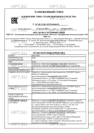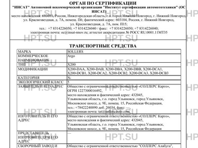| Заявитель | Общество с ограниченной ответственностью "СОЛЛЕРС Карго", ОГРН 1227300016492, место нахождения и фактический адрес: 432045, Ульяновская область, г.о. город Ульяновск, город Ульяновск, Московское шоссе, д. 9Е, помещ. 15, Российская Федерация, тел.: +78422240090 доб. 26034, факс: -, электронная почта: tat@sollers-auto.com |