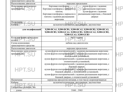 | Исполнение загрузочного пространства | бортовая платформа; бортовая платформа с каркасом и тентом; бортовая платформа с каркасом и тентом с задними распашными воротами кузов-фургон с задними распашными воротами; кузов-фургон с задними распашными воротами, с боковой дверью кузов-фургон изотермический с задними распашными воротами; кузов-фургон изотермический с задними распашными воротами, с холодильной установкой; кузов-фургон изотермический с задними распашными воротами, с отопительной установкой; кузов-фургон изотермический с задними распашными воротами, с боковой дверью; кузов-фургон изотермический с задними распашными воротами, с боковой дверью, с холодильной установкой; кузов-фургон изотермический с задними распашными воротами, с боковой дверью, с отопительной установкой |