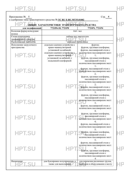 | Оборудование ТС | устройство ограничения максимальной скорости (функцию устройства ограничения максимальной скорости выполняет электронный блок управления двигателем); дневные ходовые огни; устройство вызова экстренных оперативных служб с функцией автоматического срабатывания при опрокидывании; коробка отбора мощности (КОМ) для ТС, имеющих грузоподъемное оборудование по заказу: предпусковой подогреватель двигателя; лебедка; коробка отбора мощности; кондиционер; холодильно-отопительная установка (для 7721P7, 7721P3); окна и двери; передние противотуманные фары (кроме модификаций на базе транспортных средств/шасси имеющих официальное утверждение на основании Правил ООН № 48-04) |