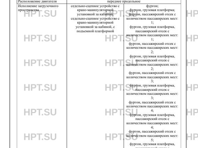 | Исполнение загрузочного пространства | седельно-сцепное устройство с крано-манипуляторной установкой за кабиной; седельно-сцепное устройство с крано-манипуляторной установкой за кабиной, с подъемной платформой фургон; фургон, грузовая платформа; фургон, пассажирский отсек с количеством пассажирских мест: 1; фургон, грузовая платформа, пассажирский отсек с количеством пассажирских мест: 1; фургон, пассажирский отсек с количеством пассажирских мест: 2; фургон, грузовая платформа, пассажирский отсек с количеством пассажирских мест: 2; фургон, пассажирский отсек с количеством пассажирских мест: 3; фургон, грузовая платформа, пассажирский отсек с количеством пассажирских мест: 3; фургон, пассажирский отсек с количеством пассажирских мест: 4; фургон, грузовая платформа, пассажирский отсек с количеством пассажирских мест: 4; фургон, пассажирский отсек с количеством пассажирских мест: 5; фургон, грузовая платформа, пассажирский отсек с количеством пассажирских мест: 5; фургон, пассажирский отсек с количеством пассажирских мест: 6; фургон, грузовая платформа, пассажирский отсек с количеством пассажирских мест: 6 фургон, грузовая платформа, крано-манипуляторная установка на заднем свесе; фургон, грузовая платформа, крано-манипуляторная установка на заднем свесе с подъемной платформой; фургон, крано-манипуляторная установка за кабиной; фургон, крано-манипуляторная установка за кабиной, с подъемной платформой; фургон, крано-манипуляторная установка на заднем свесе; фургон, крано-манипуляторная установка на заднем свесе с подъемной платформой; фургон, грузовая платформа, крано-манипуляторная установка на заднем свесе, пассажирский бортовая платформа отсек с количеством пассажирских мест: 1; фургон, грузовая платформа, крано-манипуляторная установка на заднем свесе, с подъемной платформой, пассажирский отсек с количеством пассажирских мест: 1; фургон, крано-манипуляторная установка за кабиной, пассажирский отсек с количеством пассажирских мест: 1; фургон, крано-манипуляторная установка за кабиной, с подъемной платформой, пассажирский отсек с количеством пассажирских мест: 1; фургон, крано-манипуляторная установка на заднем свесе, пассажирский отсек с количеством пассажирских мест: 1; фургон, крано-манипуляторная установка на заднем свесе, с подъемной платформой, пассажирский отсек с количеством пассажирских мест: 1; фургон, грузовая платформа, крано-манипуляторная установка на заднем свесе, пассажирский отсек с количеством пассажирских мест: 2; фургон, грузовая платформа, крано-манипуляторная установка на заднем свесе, с подъемной платформой, пассажирский отсек с количеством пассажирских мест: 2; фургон, крано-манипуляторная установка за кабиной, пассажирский отсек с количеством пассажирских мест: 2; фургон, крано-манипуляторная установка за кабиной, с подъемной платформой, пассажирский отсек с количеством пассажирских мест: 2; фургон, крано-манипуляторная установка на заднем свесе, пассажирский отсек с количеством пассажирских мест: 2; фургон, крано-манипуляторная установка на заднем свесе, с подъемной платформой, пассажирский отсек с количеством пассажирских мест: 2; фургон, грузовая платформа, крано-манипуляторная установка на заднем свесе, пассажирский отсек с количеством пассажирских мест: 3; фургон, грузовая платформа, кран