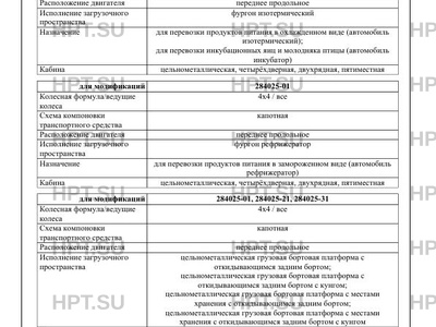 | Назначение | для перевозки продуктов питания в охлажденном виде (автомобиль изотермический); для перевозки инкубационных яиц и молодняка птицы (автомобиль инкубатор) для перевозки продуктов питания в замороженном виде (автомобиль рефрижератор) для перевозки технологического оборудования (передвижная лаборатория); для перевозки технологического оборудования и проведения работ в отсутствии стационарных ремонтных баз (передвижная мастерская); для доставки сотрудников служб МВД, МЧС к месту происшествия и проведения мероприятий во время стоянки (автомобиль аварийноспасательный); для организации командования при использовании МВД, МЧС (передвижной оперативный штаб); для организации управления предназначенный для использования МВД, МЧС (мобильный (оперативный) пункт управления) для перевозки денежной выручки и ценных грузов (класс броневой защиты - БР2 по ГОСТ 34282-2017); для перевозки денежной выручки и ценных грузов (класс броневой защиты - БР3 по ГОСТ 34282-2017); для перевозки денежной выручки и ценных грузов (класс броневой защиты - БР4 по ГОСТ 34282-2017); для перевозки денежной выручки и ценных грузов (класс броневой защиты - 2-ой по ГОСТ Р 50963-96) изм. 1; для перевозки денежной выручки и ценных грузов (класс броневой защиты - 3-ий по ГОСТ Р 50963-96) изм. 1 |