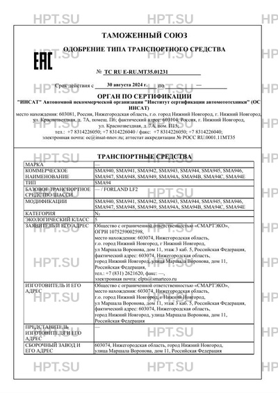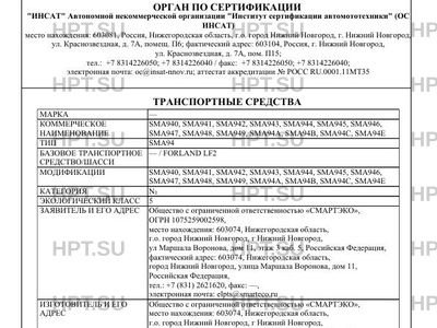 Оборудование ТС устройство вызова экстренных оперативных служб с функцией автоматического срабатывания при опрокидывании; устройство ограничения максимальной скорости (функцию устройства ограничения максимальной скорости выполняет электронный блок управления двигателем); дневные ходовые огни; кондиционер; аудиосистема; электрические стеклоподъемники; специальный предупреждающий огонь автожелтого цвета (для модификаций SMA940, SMA941, SMA942, SMA943, SMA949, SMA94C); коробка отбора мощности (для мод. с гидравлическим оборудованием) по заказу: коробка отбора мощности; обтекатель на кабину (для модификаций SMA944, SMA945, SMA946, SMA947, SMA948, SMA94A, SMA94B, SMA94E); предпусковой подогреватель двигателя; зеркала заднего вида с обогревом; холодильная установка; гидроподъемное оборудование; гидроподъемный борт; обтекатель на фургон; каркас тента; тент; сдвижная крыша; сдвижная штора; ворота; лебедка; траверса; колесные захваты; грейферы; захваты; грузовая люлька; краноманипуляторная установка (КМУ); инструментальный ящик; механизм частичной погрузки (МЧП); автономный отопитель кабины; аппарели; карманы для хранения аппарелей; противоугонная система; система видеонаблюдения; оборудование или подготовка для оборудования для контроля соблюдения водителем режимов движения, труда и отдыха; автономный жидкостной подогреватель; дополнительный подогреватель двигателя и кабины; бортовая информационноОдобрение типа транспортного средства № Стр. мультимедийная система; система помощи при парковке; технологическое оборудование мастерской; окна (для SMA94Е); отопитель; аппаратура спутниковой навигации; грузовая монтажная корзина; GPS оборудование; тахограф