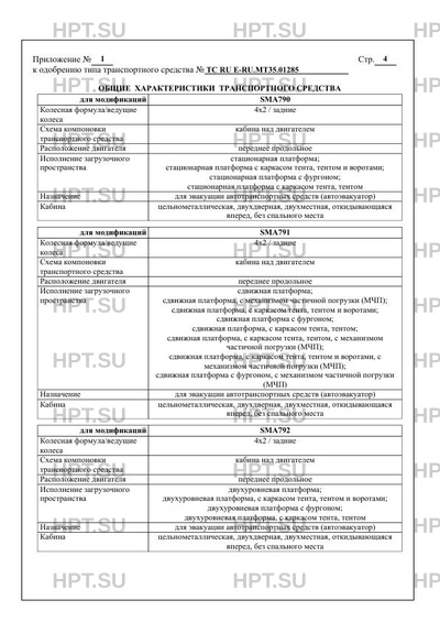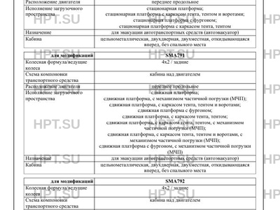 | Оборудование ТС | устройство вызова экстренных оперативных служб с функцией автоматического срабатывания при опрокидывании; электронная система контроля устойчивости; кондиционер кабины; коробка отбора мощности (для мод. с гидравлическим оборудованием); специальный предупреждающий огонь автожелтого цвета (для модификаций SMA790, SMA791, SMA792, SMA793, SMA79C); тахограф по заказу: предпусковой подогреватель двигателя; аудиосистема; GPS оборудование; обтекатель на кабину; коробка отбора мощности (для мод. без гидравлического оборудования); гидроподьемное оборудование; каркас тента; тент; сдвижная крыша; сдвижная штора; ворота; лебедка; траверса; колесные захваты; грейферы; захваты; грузовая люлька; краноманипуляторная установка (КМУ); технологическое оборудование мастерской; инструментальный ящик; механизм частичной погрузки (МЧП); отопитель; окна (для SMA79E); специальный предупреждающий огонь автожелтого цвета; грузовая монтажная корзина; аппаратура спутниковой навигации гидроподъемный борт; аппарели и карманы для хранения аппарелей; противоугонная система; система видеонаблюдения; система помощи при парковке; холодильная установка |