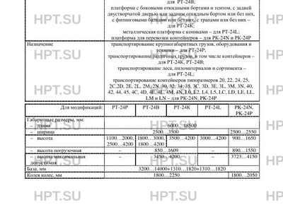 Назначение транспортирование крупногабаритных грузов, оборудования и техники - для РТ-24Р; транспортирование различных грузов, в том числе контейнеров - для РТ-24К, РТ-24В; транспортирование леса, пиломатериалов и сортимента - для РТ-24L; транспортирование контейнеров типоразмеров 20, 22, 24, 25, 2С,2D, 2E, 2L, 2М, 2N, 30, 32, 34, 35, 3C, 3D, 3E, 3L, 3M, 3N, 40, 42, 44, 45, 4C, 4D, 4E, 4L, 4M, 4N, L0, L2, L4, L5, LC, LD, LE, LL, LM и LN - для РК-24N, PK-24P