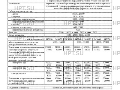 | Оборудование ТС | по заказу: трапы с механизмом подъема трапа пружинного типа или гидравлическим приводом, уширители, стойки, раздвижные стойки, устройства для крепления контейнеров, бортовая платформа в передней части (на гусаке), противооткатные упоры, автономная гидростанция, лебедка с гидравлическим или электрическим приводом, отбойные брусья, передние упоры, дополнительные опорные устройства, увязочные устройства, подъемник запасного колеса, дополнительные борта на рабочей площадке, каркас тента и тент, деревянный настил, дополнительные запасные колеса до 5 шт., топливные баки; приставные легкосплавные или металлические трапы, уголковые трапы, проблесковый маяк оранжевого цвета, ферма |