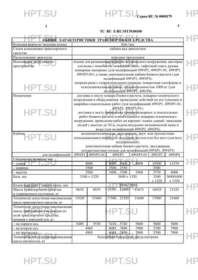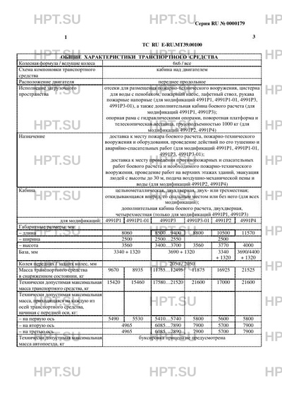| Дополнительная информация | Данное «одобрение типа транспортного средства» является распространением «одобрения типа транспортного средства» № Е-RU.МР03.А.00334, выданного до вступления в силу технического регламента Таможенного союза «О безопасности колесных транспортных средств». Коммерческие наименования транспортных средств: — автоцистерна пожарная – для транспортных средств типа 4991Р в модификациях 4991Р1, 4991Р1-01, 4991Р3, 4991Р3-01; — автолестница пожарная – для транспортных средств типа 4991Р в модификациях 4991Р2, 4991Р4. Транспортные средства типа 4991Р в модификациях 4991Р1, 4991Р1-01, 4991Р2 изготавливаются на базе шасси: марка – КАМАЗ, тип – 5350, модификации – 5350-42. Транспортные средства типа 4991Р в модификациях 4991Р3, 4991Р3-01, 4991Р4 изготавливаются на базе шасси: марка – КАМАЗ, тип – 43118, модификации – 43118-42, 43118-46. |