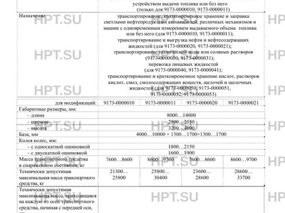 | Назначение | транспортирование, кратковременное хранение и заправка светлыми нефтепродуктами автомобилей, различных механизмов и машин с одновременным измерением выдаваемого объема топлива или без него (для 9173-0000010, 9173-0000011); транспортирование и выгрузка нефти и нефтесодержащих жидкостей (для 9173-0000020, 9173-0000021); транспортирование технической воды или соляных растворов (9173-0000030, 9173-0000031); перевозка пищевых жидкостей (для 9173-0000040, 9173-0000041); транспортирование и кратковременное хранение кислот, растворов кислот, смол, смолосодержащих веществ, щелочей и щелочных жидкостей (для 9173-0000050, 9173-0000051, 9173-0000052, 9173-0000053) |