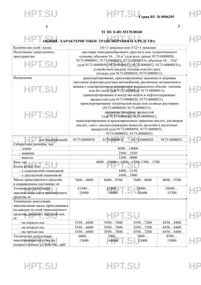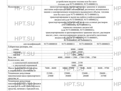 | Исполнение загрузочного пространства | цистерна чемоданообразного, круглого или эллиптического сечения, объемом 16…24 м3 (для всех, кроме 9173-0000050, 9173-0000051, 9173-0000052, 9173-0000053), объемом 16…32м3 (для 9173-0000050, 9173-0000051, 9173-0000052, 9173-0000053) с устройством выдачи топлива или без него (только для 9173-0000010, 9173-0000011) |