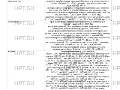 | Тип ТС | Коммерческие наименования транспортных средств: Передвижная парогенераторная установка ППУ-500/0,6 – для типа 6890-09; Автотопливозаправщик (АТЗ) – для типов 6619-51, 6619-52; Агрегат для сбора газового конденсата и нефти (АКН) – для типа 6619С-13; Автоцистерна нефтепромысловая (АЦН) – для типов 6619Н-12, 6619Н-13; Автоцистерна ассенизационная (МВ) – для типа 5676-08; Автоцистерна для технической воды и соляных растворов (АЦВ) – для типов 6621-18, 6621-19. Транспортные средства типа 6890-09 изготавливаются на базе шасси: марка – Урал, тип – 4320, модификации – 4320-1951-60, 4320-1951-70, 4320-1951-62, 4320-1951-72, 4320-1951-74. Транспортные средства типов 6619-51, 6619С-13, 6619Н-12, 6621-18, 5676-08 изготавливаются на базе шасси: марка – Урал, тип – 4320, модификации – 4320-1951-60, 4320-1951-62, 4320-1951-70, 4320-1951-72, 4320-1951-74, 4320-6951-70, 4320-6951-72, 4320-6951-74, 4320-4951-78, 4320-4951-80, 4320-4951-82, 4320-4972-78, 4320-4972-80, 4320-4972-82. Транспортные средства типов 6619-52, 6619Н-13, 6621-19 изготавливаются на базе шасси: марка – Урал, тип – 5557, модификации – 5557-1151-60, 5557-1151-62, 5557-1151-70, 5557-1151-72, 5557-1151-74, 5557-6151-70, 5557-6151-72, 5557-6151-74, 5557-4151-78, 5557-4151-80, 5557-4151-82, 5557-4551-78, 5557-4551-80, 5557-4551-82. Транспортные средства 6619-51, 6619-52, 6619С-13, 6619Н-12, 6619Н-13 относятся к транспортным средствам FL (в соответствии с п. 9.1.1.2 ДОПОГ). |