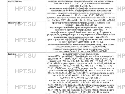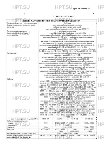 | Тип ТС | Данное «Одобрение типа транспортного средства» является распространением «Одобрения типа транспортного средства» № Е-RU.МТ39.А.00282, выданного до вступления в силу технического регламента Таможенного союза «О безопасности колесных транспортных средств». Коммерческие наименования транспортных средств: Передвижная парогенераторная установка ППУ-500/0,6 – для типа 6890-09; Автотопливозаправщик (АТЗ) – для типов 6619-51, 6619-52; Агрегат для сбора газового конденсата и нефти (АКН) – для типа 6619С-13; Автоцистерна нефтепромысловая (АЦН) – для типов 6619Н-12, 6619Н-13; Автоцистерна ассенизационная (МВ) – для типа 5676-08; Автоцистерна для технической воды и соляных растворов (АЦВ) – для типов 6621-18, 6621-19. Транспортные средства типа 6890-09 изготавливаются на базе шасси: марка – Урал, тип – 4320, модификации – 4320-1951-60, 4320-1951-70, 4320-1951-62, 4320-1951-72, 4320-1951-74. Транспортные средства типов 6619-51, 6619С-13, 6619Н-12, 6621-18, 5676-08 изготавливаются на базе шасси: марка – Урал, тип – 4320, модификации – 4320-1951-60, 4320-1951-62, 4320-1951-70, 4320-1951-72, 4320-1951-74, 4320-6951-70, 4320-6951-72, 4320-6951-74, 4320-4951-78, 4320-4951-80, 4320-4951-82, 4320-4972-78, 4320-4972-80, 4320-4972-82. Транспортные средства типов 6619-52, 6619Н-13, 6621-19 изготавливаются на базе шасси: марка – Урал, тип – 5557, модификации – 5557-1151-60, 5557-1151-62, 5557-1151-70, 5557-1151-72, 5557-1151-74, 5557-6151-70, 5557-6151-72, 5557-6151-74, 5557-4151-78, 5557-4151-80, 5557-4151-82, 5557-4551-78, 5557-4551-80, 5557-4551-82. Транспортные средства 6619-51, 6619-52, 6619С-13, 6619Н-12, 6619Н-13 относятся к транспортным средствам FL (в соответствии с п. 9.1.1.2 ДОПОГ). |
