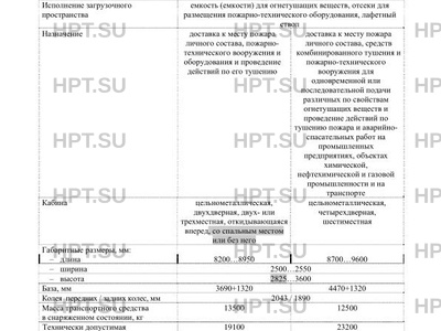 | Оборудование ТС | пожарно-техническое оборудование и отсеки для его размещения, электрооборудование (фары-прожекторы в передней и задней частях автомобиля, сигнальная громкоговорящая установка (СГУ), проблесковый(е) маяк(и) синего цвета), устройство вызова экстренных оперативных служб с функцией автоматического срабатывания при опрокидывании |