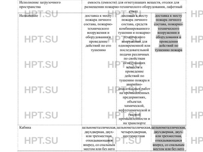 | Оборудование ТС | пожарно-техническое оборудование и отсеки для его размещения, электрооборудование (фары-прожекторы в передней и задней частях автомобиля, сигнальная громкоговорящая установка (СГУ), проблесковый(е) маяк(и) синего цвета), устройство вызова экстренных оперативных служб с функцией автоматического срабатывания при опрокидывании |