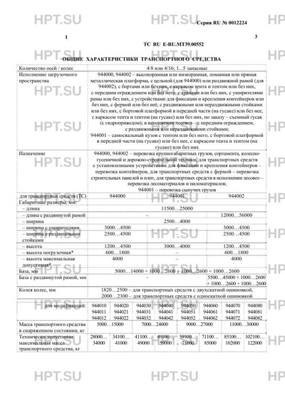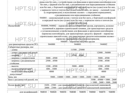 Назначение 944000, 944002 - перевозка крупногабаритных грузов, сортамента, колесногусеничной и дорожно-строительной техники, для транспортных средств с установленными устройствами для фиксации и крепления контейнеров - перевозка контейнеров, для транспортных средств с фермой - перевозка строительных панелей и плит, для транспортных средств в исполнении лесовоз - перевозка лесоматериалов и пиломатериалов; 944001 - перевозка сыпучих грузов