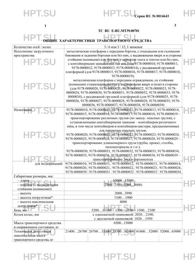 | Дополнительная информация | Транспортные средства: марка – УЗСТ, тип – 9178, модификации – 9178-0000010, 9178-0000011, 9178-0000012, 9178-0000013, 9178-0000014, 9178-0000015, 9178-0000016, 9178-0000017, 9178-0000018, 9178-0000019 в исполнении для перевозки опасных грузов, в соответствии с главой 9.1 ДОПОГ, относятся к транспортным средствам EX/II, EX/III, FL и AT. В случае несоответствия параметров транспортных средств значениям, установленным приложением № 5 к техническому регламенту Таможенного союза «О безопасности колесных транспортных средств», для передвижения данных транспортных средств по территории государств – членов Таможенного союза необходимо оформление специального разрешения. |