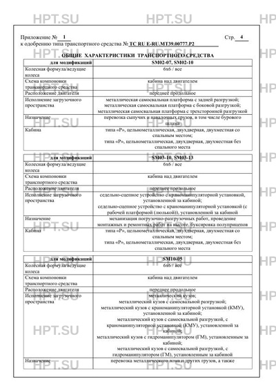 | Оборудование ТС | централизованная система регулирования давления воздуха в шинах; устройство ограничения максимальной скорости (функцию устройства ограничения максимальной скорости выполняет электронный блок управления двигателем); устройство вызова экстренных оперативных служб с автоматическим срабатыванием при опрокидывании; дневные ходовые огни (для транспортных средств соответствующих требованиям Правил ООН № 48-04) по заказу: коробки отбора мощности; предпусковой подогреватель двигателя; лебедка; держатель запасного колеса; аппаратура спутниковой навигации; тахограф; кондиционер; задние распашные ворота (для SM02-07, SM02-10); тент (для SM02-07, SM02-10); каркас тента и тент (для SM12-02, SM12-05, SM13-02, SM13-05); один или два проблесковых маяка (для SM16-01) |