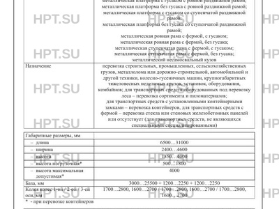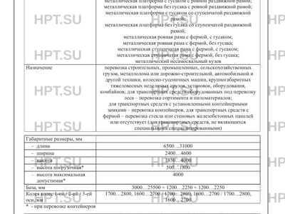 | Оборудование ТС | запасное колесо по заказу: дополнительное запасное колесо; дополнительные два запасных колеса; противооткатные упоры; топливные баки; инструментальные ящики; один проблесковый маячок оранжевого цвета; два проблесковых маячка оранжевого цвета; тягово-сцепное устройство; устройства для фиксации груза; съемные ложементы для крепления груза; дополнительные опоры; задние распашные двери; тент; боковая обвязка рамы; скос в задней части рамы; механизм отсоединения гусака; металлический настил; деревянный настил; съемные борта; несъемные борта; каркас тента; уширители; раздвижные стойки для фиксации груза; нераздвижные стойки для фиксации груза; переднее ограждение; трапы механические одноступенчатые; трапы механические двухступенчатые; трапы гидравлические одноступенчатые; трапы гидравлические двухступенчатые; трапы уголковые; трапы приставные; съемная ферма; лебедка; замки для крепления оборудования; контейнерные замки; автономная гидростанция; кильблоки; отбойные брусья |