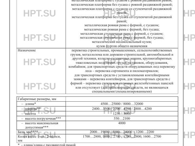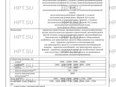 | Назначение | перевозка строительных, промышленных, сельскохозяйственных грузов, металлолома или дорожно-строительной, автомобильной и другой техники, колесно-гусеничных машин, крупногабаритных тяжеловесных неделимых грузов, установок, оборудования, комбайнов; для транспортных средств оборудованных под перевозку леса - перевозка сортимента и пиломатериалов |