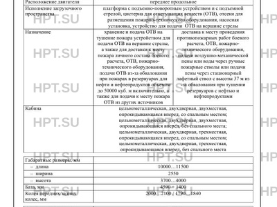 Исполнение загрузочного пространства платформа с подъемно-поворотным устройством и с подъемной стрелой, цистерна для огнетушащих веществ (ОТВ), отсеки для размещения пожарно-технического оборудования, насосная установка, устройство для подачи ОТВ на вершине стрелы ТВ), отсеки для размещения пожарно-технического оборудования, насосная установка, устройство для подачи ОТВ на вершин