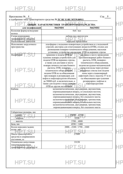 Оборудование ТС подъемно-поворотное устройство с подъемной стрелой, ёмкость для огнетушащих веществ, пожарно-техническое оборудование и отсеки для его размещения, электрооборудование (фары-искатели в передней и задней частях автомобиля, сигнальная громкоговорящая установка (СГУ), проблесковые маяки синего цвета); устройство вызова экстренных оперативных служб с функцией автоматического срабатывания при опрокидывании; устройство ограничения максимальной скорости (ограничение максимальной скорости осуществляется электронной системой управления двигателем) по заказу: аппаратура спутниковой навигации