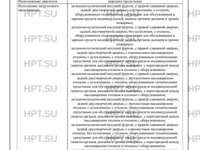 | Исполнение загрузочного пространства | цельнометаллический несущий фургон, с правой сдвижной дверью, задней двустворчатой дверью, с остеклением, с отсеком, оборудованным техническими средствами для обслуживания и зарядки средств индивидуальной защиты органов дыхания и зрения пожарных; цельнометаллический несущий фургон, с правой сдвижной дверью, задней двустворчатой дверью, без остекления, с отсеком, оборудованным техническими средствами для обслуживания и зарядки средств индивидуальной защиты органов дыхания и зрения пожарных; цельнометаллический несущий фургон, с правой сдвижной дверью, задней двустворчатой дверью, с одноместным пассажирским отсеком, с остеклением, с отсеком, оборудованным техническими средствами для обслуживания и зарядки средств индивидуальной защиты органов дыхания и зрения пожарных, с перегородкой между пассажирским отсеком и отсеком с оборудованием; цельнометаллический несущий фургон, с правой сдвижной дверью, задней двустворчатой дверью, с двухместным пассажирским отсеком, с остеклением, с отсеком, оборудованным техническими средствами для обслуживания и зарядки средств индивидуальной защиты органов дыхания и зрения пожарных, с перегородкой между пассажирским отсеком и отсеком с оборудованием; цельнометаллический несущий фургон, с правой сдвижной дверью, задней двустворчатой дверью, с трехместным пассажирским отсеком, с остеклением, с отсеком, оборудованным техническими средствами для обслуживания и зарядки средств индивидуальной защиты органов дыхания и зрения пожарных, с перегородкой между пассажирским отсеком и отсеком с оборудованием; цельнометаллический несущий фургон, с правой сдвижной дверью, задней двустворчатой дверью, с одноместным пассажирским отсеком, без остекления, с отсеком, оборудованным техническими средствами для обслуживания и зарядки средств индивидуальной защиты органов дыхания и зрения пожарных, с перегородкой между пассажирским отсеком и отсеком с оборудованием; цельнометаллический несущий фургон, с правой сдвижной дверью, задней двустворчатой дверью, с двухместным пассажирским отсеком, без остекления, с отсеком, оборудованным техническими средствами для обслуживания и зарядки средств индивидуальной защиты органов дыхания и зрения пожарных, с перегородкой между пассажирским отсеком и отсеком с оборудованием; цельнометаллический несущий фургон, с правой сдвижной дверью, задней двустворчатой дверью, с трехместным пассажирским отсеком, без остекления, с отсеком, оборудованным техническими средствами для обслуживания и зарядки средств индивидуальной защиты органов дыхания и зрения пожарных, с перегородкой между пассажирским отсеком и отсеком с оборудованием цельнометаллический несущий фургон, с правой сдвижной дверью, задней двустворчатой дверью, с одноместным пассажирским отсеком, с остеклением, с отсеком, оборудованным техническими средствами для обслуживания и зарядки средств индивидуальной защиты органов дыхания и зрения пожарных, без перегородки между пассажирским отсеком и отсеком с оборудованием; цельнометаллический несущий фургон, с правой сдвижной дверью, задней двустворчатой дверью, с двухместным пассажирским отсеком, с остеклением, с отсеком, оборудованным техническими средствами для обслуживания и зарядки средств 