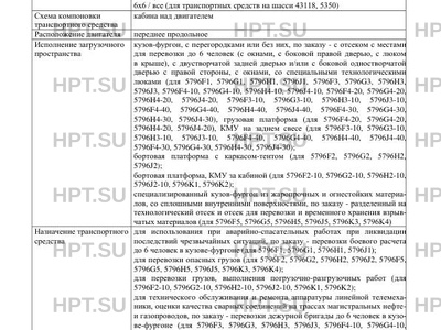 | Исполнение загрузочного пространства | кузов-фургон, с перегородками или без них, по заказу - с отсеком с местами для перевозки до 6 человек (с окнами, с боковой правой дверью, с люком в крыше), с двустворчатой задней дверью и/или с боковой одностворчатой дверью с правой стороны, с окнами, со специальными технологическими люками (для 5796F1, 5796G1, 5796H1, 5796J1, 5796F3, 5796G3, 5796H3, 5796J3, 5796F4-10, 5796G4-10, 5796H4-10, 5796J4-10, 5796F4-20, 5796G4-20, 5796H4-20, 5796J4-20, 5796F3-10, 5796G3-10, 5796H3-10, 5796J3-10, 5796F4-40, 5796G4-40, 5796H4-40, 5796J4-40, 5796F4-30, 5796G4-30, 5796H4-30, 5796J4-30), грузовая платформа (для 5796F4-20, 5796G4-20, 5796H4-20, 5796J4-20), КМУ на заднем свесе (для 5796F3-10, 5796G3-10, 5796H3-10, 5796J3-10, 5796F4-40, 5796G4-40, 5796H4-40, 5796J4-40, 5796F4-30, 5796G4-30, 5796H4-30, 5796J4-30); бортовая платформа с каркасом-тентом (для 5796F2, 5796G2, 5796H2, 5796J2); бортовая платформа, КМУ за кабиной (для 5796F2-10, 5796G2-10, 5796H2-10, 5796J2-10, 5796K1, 5796K2); специализированный кузов-фургон из жаропрочных и огнестойких материалов, со сплошными внутренними поверхностями, по заказу - разделенный на технологический отсек и отсек для перевозки и временного хранения взрывчатых материалов (для 5796F5, 5796G5, 5796H5, 5796J5, 5796K3, 5796K4) |