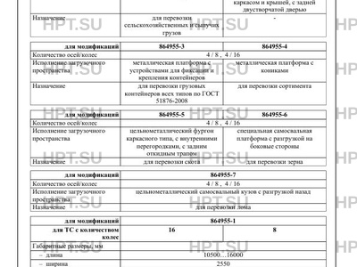 | Оборудование ТС | запасное колесо, противооткатные упоры по заказу: инструментальный ящик, мыльница; тент (для модификаций 864955-1, 864955-2, 864955-6, 864955-7) |
