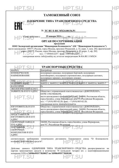 | Предприятие-изготовитель | Общество с ограниченной ответственностью «ДОНТРЕЙЛЕР», место нахождения и фактический адрес: 346880, Ростовская область, город Батайск, улица Фермерская, дом 9 Г, Российская Федерация |