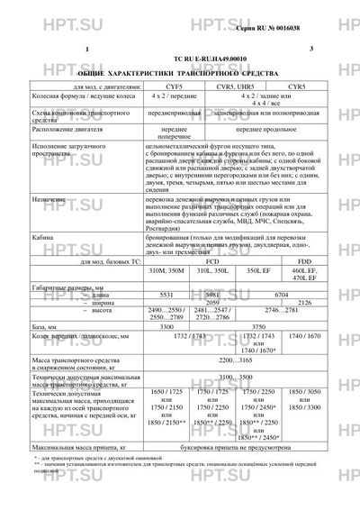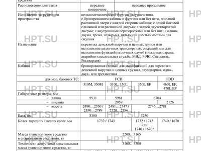 | Кабина | бронированная (только для модификаций для перевозки денежной выручки и ценных грузов), двухдверная, одно-, двухили трехместная для мод. базовых ТС: FCD FDD 310M, 350M 310L, 350L 350L EF 460L EF, 470L EF |