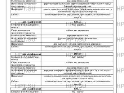 | Исполнение загрузочного пространства | фургон общего назначения с грузоподъемным бортом или без него, с боковой дверью или без нее фургон с окнами/дверьми - автомагазин бортовая платформа с краном-манипулятором (КМУ), в том числе с люлькой для подъема людей специальная платформа для транспортировки автомобилей с краномманипулятором (КМУ) или без него автогидроподъемник (АГП) фургон с окнами/дверьми для перевозки животных или фургон/модуль с дверьми, с окнами или без них, с платформой (в том числе с тентом или без него, с откидными боковыми и задним бортами, с высоким передним бортом, или кузов с тентом и задними распашными воротами) и размещенным на ней оборудованием для перевозки живой рыбы фургон с окнами/дверьми для временного проживания (автодом) самосвальная платформа с крано-манипуляторной установкой (КМУ) или без нее автомобиль со специальной платформой для установки сменных кузовов с крюковым устройством, с краном-манипулятором или без него фургон с окнами/дверьми медицинской службы, медицинский комплекс фургон изотермический или рефрижератор, с грузоподъемным бортом и (или) ХОУ (холодильно-отопительной установкой) или без таковых, с боковой дверью или без нее фургон для перевозки хлебобулочных или кондитерских изделий с задней и (или) боковыми дверьми, с холодильно-отопительной установкой (ХОУ) или без нее фургон с окнами/дверьми - автомастерская, автолаборатория с отсеком для размещения до 6-ти сидений, используемых исключительно во время стоянки, или без них, с перегородкой грузового отсека или без нее, с грузоподъемным бортом или без него фургон с окнами/дверьми - автомастерская, автолаборатория, с отсеком для размещения до 6-ти сидений, используемых исключительно во время стоянки, или без них, с перегородкой грузового отсека или без нее, с платформой и (или) с краноманипуляторной установкой (КМУ) или без таковых бортовая платформа с каркасом и тентом или без него, с откидными боковыми и задним бортами, с высоким передним бортом, или кузов с тентом и задними распашными воротами, с грузоподъемным бортом или без него |