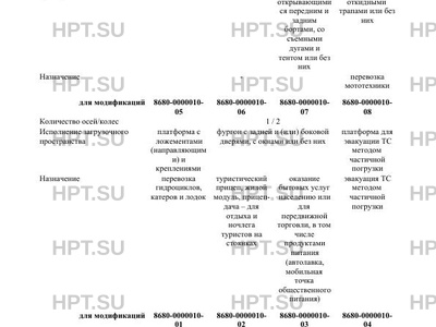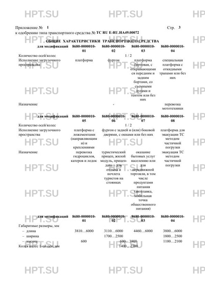 | Тип ТС | Транспортные средства не предназначены для перевозки пищевых и опасных грузов. Транспортные средства типа 8680, коммерческое наименование 8680-0000010: модификации 8680-0000010-01 – Прицеп платформа; модификации 8680-0000010-02 - Прицеп фургон; модификации 8680-0000010-03 – Прицеп бортовой; модификации 8680-0000010-04 – Прицеп для перевозки мототехники; модификации 8680-0000010-05 – Прицеп для перевозки водного транспорта; модификации 8680-0000010-06 – Прицеп торговый; модификации 8680-0000010-07 – Прицеп дача; модификации 8680-0000010-08 – Прицеп для эвакуации ТС методом частичной погрузки. |
