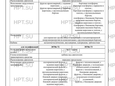 | Исполнение загрузочного пространства | фургон промтоварный, с задними воротами; фургон промтоварный, с задними воротами, с грузоподъемным бортом бортовая платформа; бортовая платформа с каркасом и тентом; бортовая платформа с каркасом и тентом, с грузоподъемным бортом; платформа с боковыми бортами, передним высоким бортом, задними воротами и тентом; платформа с боковыми бортами, передним высоким бортом, задними воротами и тентом, с грузоподъемным бортом изотермический фургон, с задними воротами; изотермический фургон, с задними воротами, с грузоподъемными воротами; изотермический фургон, с боковой дверью (дверьми); изотермический фургон, с боковой дверью (дверьми), задними воротами; изотермический фургон, с боковой дверью (дверьми), задними воротами, с грузоподъемным бортом; изотермический фургон, с задними воротами, отопительнохолодильной установкой; изотермический фургон, с задними воротами, с грузоподъемными воротами, отопительно-холодильной установкой; фургон с теплоизоляцией, с боковыми дверьми, с холодильноотопительной установкой; фургон с теплоизоляцией, с боковыми дверьми; фургон, с боковыми дверьми, с холодильно-отопительной установкой; фургон, с боковыми дверьми изотермический фургон, с боковой дверью (дверьми), отопительно-холодильной установкой; изотермический фургон, с боковой дверью (дверьми), задними воротами, отопительнохолодильной установкой; изотермический фургон, с боковой дверью (дверьми), задними воротами, с грузоподъемным бортом, отопительно-холодильной установкой |