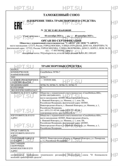 | Заявитель | Общество с ограниченной ответственностью "СпецМобиль-НН", ОГРН 1085260018953, место нахождения: 603005, Нижегородская область, г. Нижний Новгород, ул. Минина, д. 1, пом. П6, Российская Федерация, фактический адрес: 603005, Нижегородская область, г. Нижний Новгород, ул. Минина, д. 1, Российская Федерация, тел.: (831) 211-82-44, факс: (831) 211-82-44, электронная почта: spec-mobil@bk.ru |