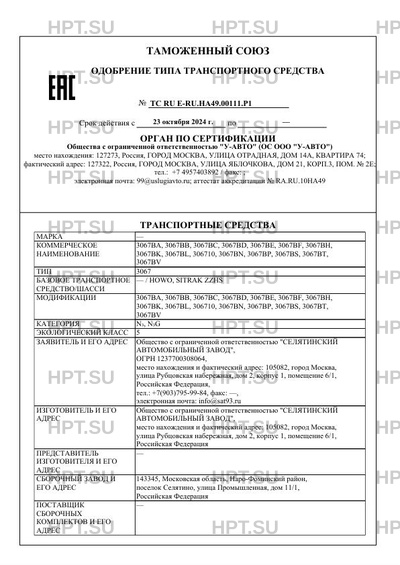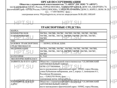Предприятие-изготовитель Общество с ограниченной ответственностью "СЕЛЯТИНСКИЙ АВТОМОБИЛЬНЫЙ ЗАВОД", место нахождения и фактический адрес: 105082, город Москва, улица Рубцовская набережная, дом 2, корпус 1, помещение 6/1, Российская Федерация