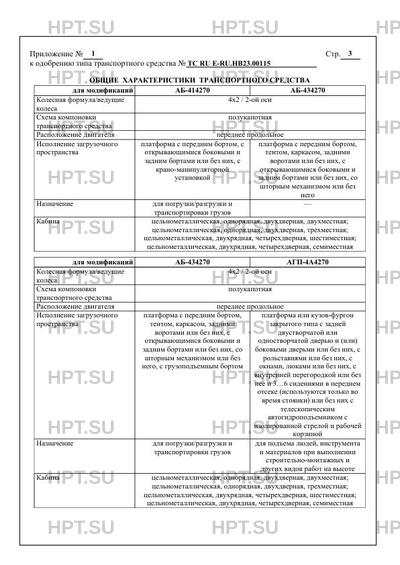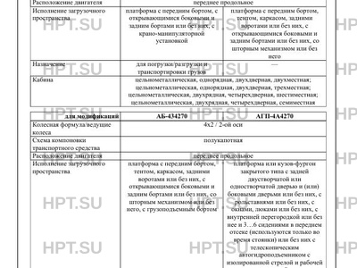 | Исполнение загрузочного пространства | платформа с передним бортом, с открывающимися боковыми и задним бортами или без них, с крано-манипуляторной установкой платформа с передним бортом, тентом, каркасом, задними воротами или без них, с открывающимися боковыми и задним бортами или без них, со шторным механизмом или без него платформа с передним бортом, тентом, каркасом, задними воротами или без них, с открывающимися боковыми и задним бортами или без них, со шторным механизмом или без него, с грузоподъемным бортом платформа или кузов-фургон закрытого типа с задней двустворчатой или одностворчатой дверью и (или) боковыми дверьми или без них, с рольставнями или без них, с окнами, люками или без них, с внутренней перегородкой или без нее и 3…6 сидениями в переднем отсеке (используются только во время стоянки) или без них с телескопическим автогидроподъемником с изолированной стрелой и рабочей корзиной кузов-фургон закрытого типа с задней двустворчатой или одностворчатой дверью или без них и (или) боковыми дверьми или без них, с рольставнями или без них, с люками или без них, с окнами или без них, с внутренней перегородкой или без нее и 3…6 сидениями в переднем отсеке (используются только во время стоянки), с грузоподъемным бортом или без него самосвальная платформа с трехсторонней или задней разгрузкой при помощи гидравлического механизма кузов-фургон закрытого типа (промтоварный) с задней двустворчатой или одностворчатой дверью и (или) боковыми дверьми или без них, с рольставнями или без них, с люками или без них, с окнами или без них, со ставнями или без них, с внутренними перегородками или без них кузов-фургон закрытого типа (промтоварный) с задней двустворчатой или одностворчатой дверью и (или) боковыми дверьми или без них, с рольставнями или без них, с люками или без них, с окнами или без них, со ставнями или без них, с внутренними перегородками или без них, с грузоподъемным бортом кузов-фургон закрытого типа (изотермический, рефрижератор, отапливаемый, ледник) с задней двустворчатой или одностворчатой дверью и (или) боковыми дверьми или без них, с рольставнями или без них, с люками или без них, с окнами или без них, со ставнями или без них, с внутренними перегородками или без них с грузоподъемным бортом или без него платформа с краномманипулятором платформа стационарная с выдвижными трапами, или платформа двухъярусная (нижняя - стационарная с выдвижными трапами, верхняя - опускающаяся при помощи гидравлического механизма), или платформа подъемно-сдвижная при помощи гидравлического механизма кузов-фургон закрытого типа с задней двустворчатой или одностворчатой дверью или без них и (или) боковыми дверьми или без них, с рольставнями или без них, с люками или без них, с окнами или без них, с внутренней перегородкой или без нее и 3…6 сидениями в переднем отсеке (используются только во время стоянки), с грузоподъемным бортом или без него кузов-фургон закрытого типа с задней двустворчатой или одностворчатой дверью или без них и (или) боковыми дверьми или без них, с рольставнями или без них, с люками или без них, с окнами или без них, с внутренней перегородкой или без нее и 3…6 сидениями в переднем отсеке (используются только во время стоянки), с грузоподъемным бортом или без него |