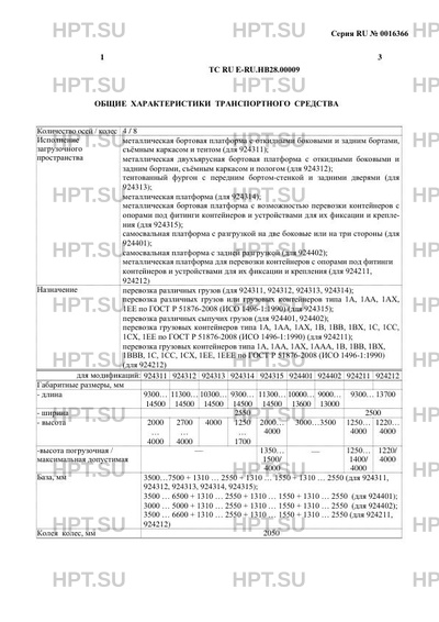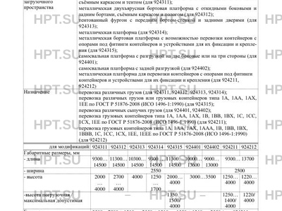 | Назначение | перевозка различных грузов (для 924311, 924312, 924313, 924314); перевозка различных грузов или грузовых контейнеров типа 1А, 1АА, 1АХ, 1ЕЕ по ГОСТ Р 51876-2008 (ИСО 1496-1:1990) (для 924315); перевозка различных сыпучих грузов (для 924401, 924402); перевозка грузовых контейнеров типа 1А, 1АА, 1АХ, 1В, 1ВВ, 1ВХ, 1С, 1СС, 1СХ, 1ЕЕ по ГОСТ Р 51876-2008 (ИСО 1496-1:1990) (для 924211); перевозка грузовых контейнеров типа 1А, 1АА, 1АХ, 1ААА, 1В, 1ВВ, 1ВХ, 1ВВВ, 1С, 1СС, 1СХ, 1ЕЕ, 1ЕЕЕ по ГОСТ Р 51876-2008 (ИСО 1496-1:1990) (для 924212) |