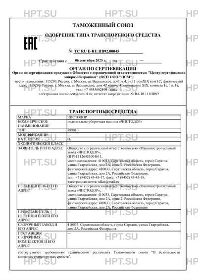 | Коммерческое наименование | подметально-уборочная машина «ЧИСТОДОР» |