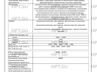 | Назначение | для раздельной транспортировки к местам производства взрывных работ невзрывчатых компонентов далее НВВ (эмульсии , газогенерирующей добавки и ускорителя газификации, загружаемых на заводе изготовления эмульсии или на стационарном пункте), изготовления из них в месте производства взрывов (карьеры, стройплощадки) эмульсионных промышленных ВВ (далее ЭВВ) и механизированного заряжания ими по зарядному шлангу методом "под столб воды" скважин любой степени обводнённости |