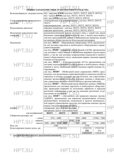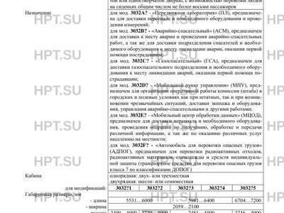 | Оборудование ТС | специальный предупреждающий огонь синего цвета, СГУ, цветографическая схема (для ТС оперативных служб), ГЛОНАСС, тахограф (для ТС мод. 3032F?), для всех: устройство вызова экстренных оперативных служб, по заказу для всех: тахограф, стеллажи, ящики, полки, шкафы, столы, верстаки, газовые баллоны, рундуки, спальные места, места для сидения (перевозки людей), кресла, лебедки, климатические установки (хладагент R134А), системы воздухообмена и фильтровентиляционные установки, оборудование для автономного энергоснабжения, багажная платформа, лестницы на крыше, лестницы на задней двери, видео-аудиоаппарутура, средства связи и освещения, средства индивидуальной защиты и оказания первой помощи, телекоммуникационные комплексы, спецоборудование, лабораторная мебель, аналитическое оборудование и оборудование для микробиологических исследований, инструмент, кран-балки с лебедками грузоподъемностью до 1000 кг, световая панель или проблесковые маячки желтого (оранжевого) цвета, система радиационного контроля измерительная МКС-16ЭЦ "Барьер", установка дозиметрическая "Гамма-сенсор", дозиметр-радиометр ДКС-96 и другие |