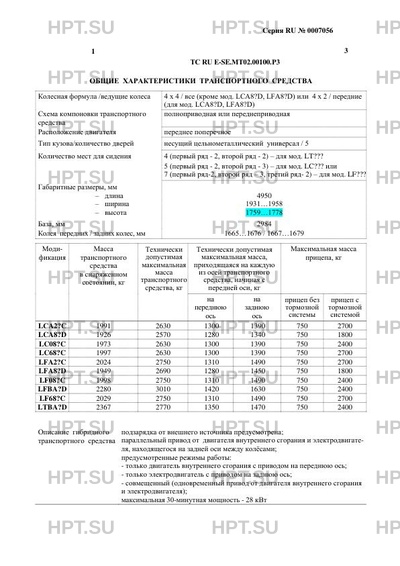 | Описание гибридного ТС | подзарядка от внешнего источника предусмотрена; параллельный привод от двигателя внутреннего сгорания и электродвигателя, находящегося на задней оси между колёсами; предусмотренные режимы работы: - только двигатель внутреннего сгорания с приводом на переднюю ось; - только электродвигатель с приводом на заднюю ось; - совмещенный (одновременный привод от двигателя внутреннего сгорания и электродвигателя); максимальная 30-минутная мощность - 28 кВт |