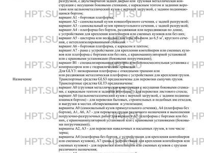 | Оборудование ТС | противооткатные башмаки, шкаф для огнетушителя, ящик для инструментов по заказу: запасное колесо, бак для воды, держатель запасных шин, компрессор (для ТС: GLS3, GLT3 вариант В1) |