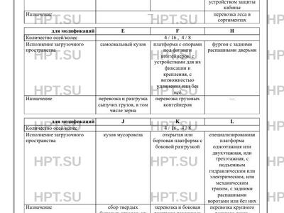 | Исполнение загрузочного пространства | бортовая платформа бортовая платформа с каркасным тентом и задними воротами сортиментовозная платформа с кониками и с устройством защиты кабины самосвальный кузов платформа с опорами под фитинги контейнеров, с устройствами для их фиксации и крепления, с возможностью удлинения или без неё фургон с задними распашными дверьми кузов мусоровоза открытая или бортовая платформа с боковой разгрузкой специализированная платформа одноэтажная или двухэтажная, или трехэтажная, с подъемным гидравлическим или электрическим, или механическим трапом, с задними распашными воротами или без них |