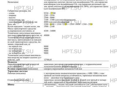 | Тип ТС | Транспортное средство не предназначено для перевозки опасных грузов. В случае фактического превышения значений параметров, указанных в приложении № 5 к техническому регламенту Таможенного союза «О безопасности колесных транспортных средств» (ТР ТС 018/2011), для передвижения транспортных средств по территории государств – членов Таможенного союза необходимо оформление специального разрешения. |