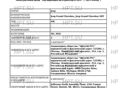 | Дополнительная информация | Транспортные средства не предназначены для коммерческих перевозок пассажиров. Транспортные средства с коммерческими наименованиями Jeep Grand Cherokee SRT, Jeep Grand Cherokee (в комплектации Summit, Тrackhawk) относятся к категории M1. Транспортные средства с коммерческим наименованием Jeep Grand Cherokee относятся к категории M1G (кроме комплектации Summit, Тrackhawk). |